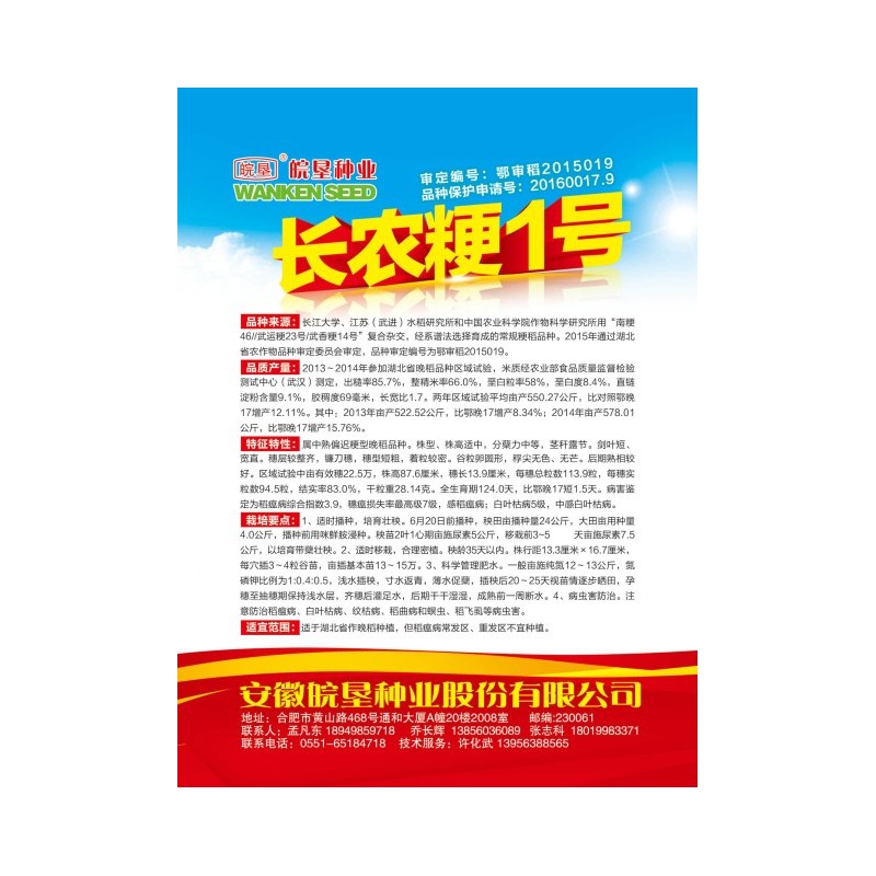 【風險提示】:種子應儲藏在低溫(25℃以下)、干燥(相對濕度70%以下)及通風處;種子調運后及時做好防潮、防濕、防蟲、防鼠等工作并在上述條件下進行儲藏,做到在安全儲藏條件下、質量保證期內規范安全用種;請遵照當地農技部門做好科學栽培,做好稻瘟病、白葉枯、稻曲病、紋枯病、條紋葉枯病、黑條矮縮病、螟蟲、稻飛虱等病蟲害的綜合防治工作,由于栽培措施不當和病蟲害及氣候等因素造成的一切損失責任自負;按審定適宜種植區域種植,超區域銷售或種植造成的損失責任自負,公司概不負責;根據種植季節結合當地合理安排播期,規避因高低溫、風暴倒伏等人為不可抗逆因素造成的損失。