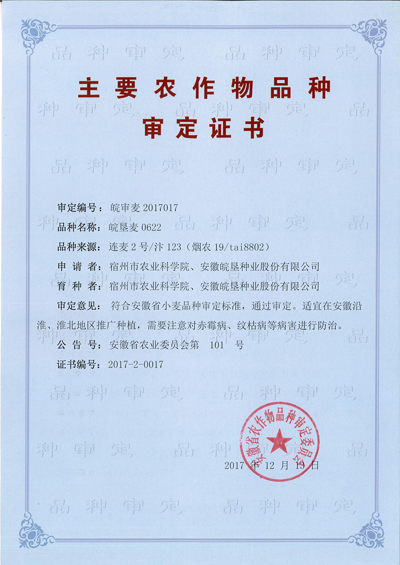 審定意見:符合安徽省小麥品種審定標(biāo)準(zhǔn),通過審定。適宜在安徽沿淮、淮北地區(qū)推廣種植,需要注意對赤霉病、紋枯病等病害進(jìn)行防治。